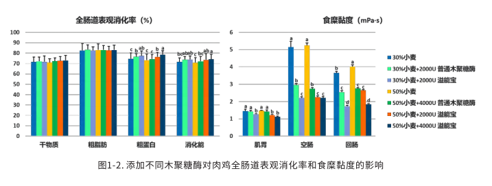 肉雞小麥日糧中添加“酸性木聚糖酶”能顯著提高肉雞的粗蛋白和能量的消化率,降低胃、小腸的食糜黏度,提高胃蛋白酶、胰島白酶和淀粉酶的消化率,提高肉雞的生產(chǎn)性能